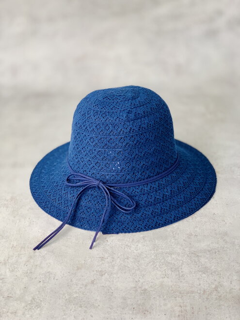 (12719)Der dunkelblaue Damenhut ist ideal für sonnige Sommertage. Rundherum befindet sich eine Kordel, die das Aussehen des Hutes perfekt ergänzt.