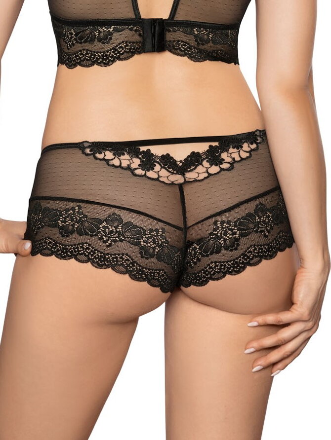 Damen-Spitzen-Boxer Höschen in schwarze Farbe. Dieses Modell hat ein interessantes Spitzenmuster aus Blumen und Ornamenten. Auf der Rückseite gibt es auf die Oberkante einen kleinen Ausschnitt. Diese Boxer Höschen formen den Arsch schön. Die Spitze fühlt sich sehr angenehm an und reitzt die Haut nicht. Sie können auch einen Bralette-BH kaufen und mit diesem Höschen ein sexy Unterwäscheset kreieren.