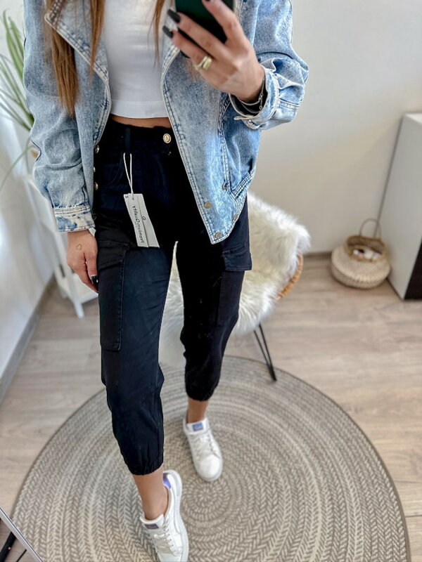 NEUHEIT! Damen Jeans mit hoher Bund in Schwarz. Die Jeans sind am unteren Ende mit einem Gummiband versehen, und an den Seiten der Jeans befinden sich Taschen.